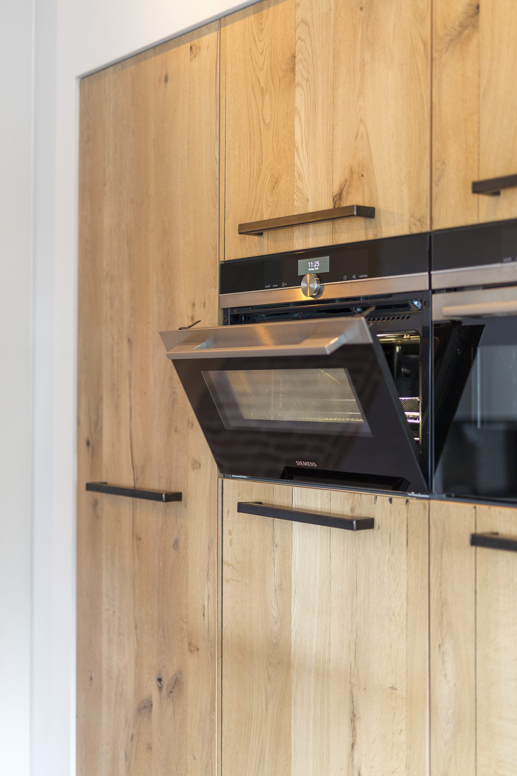 Deze eiken keuken is uitgevoerd in massief eiken fineer met een Hi-macs blad.