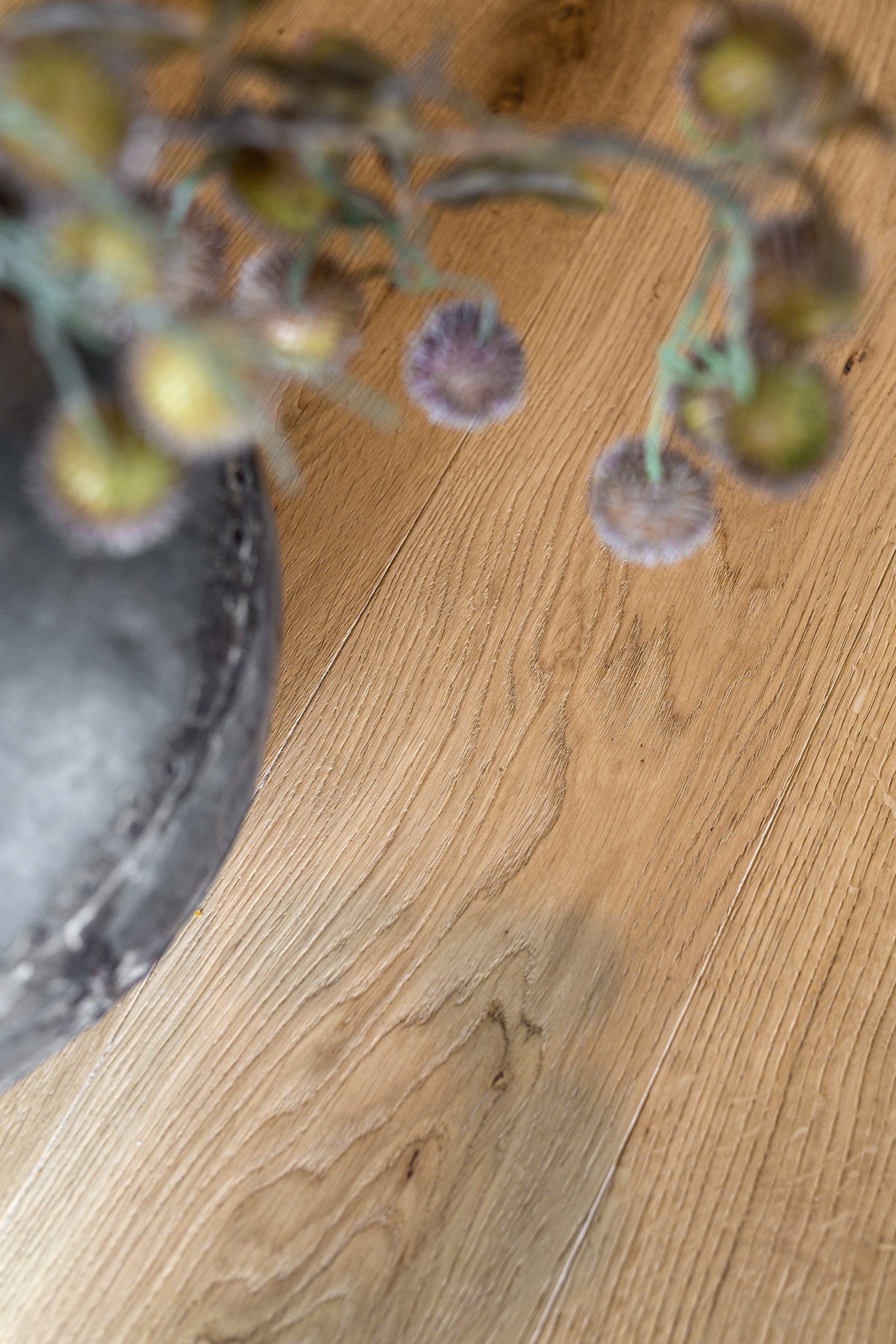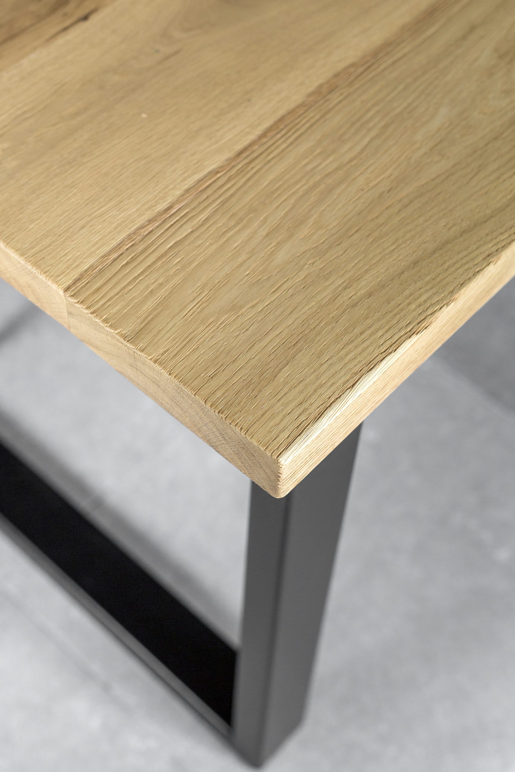 Een eiken eettafel is voorzien van een stalen onderstel.