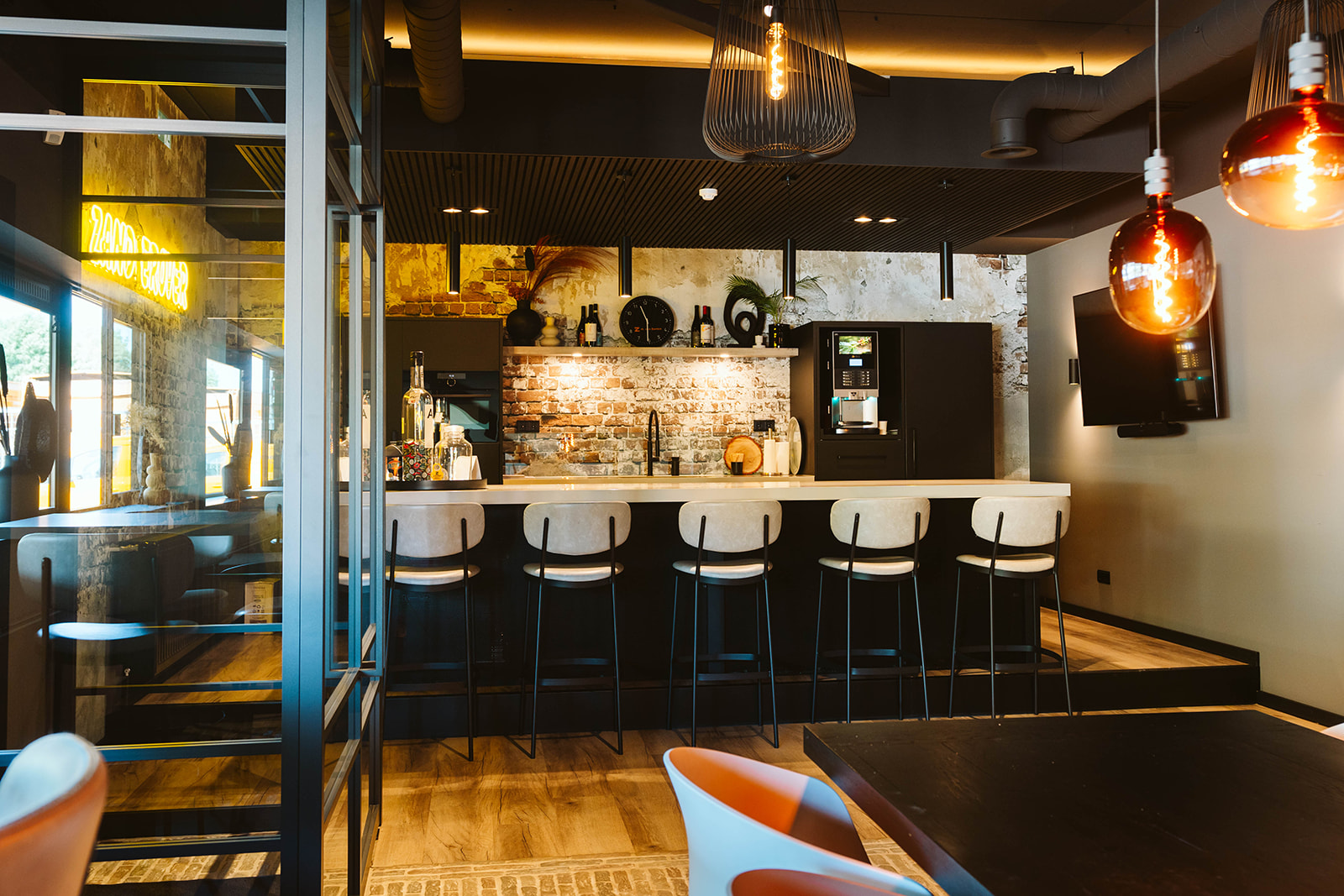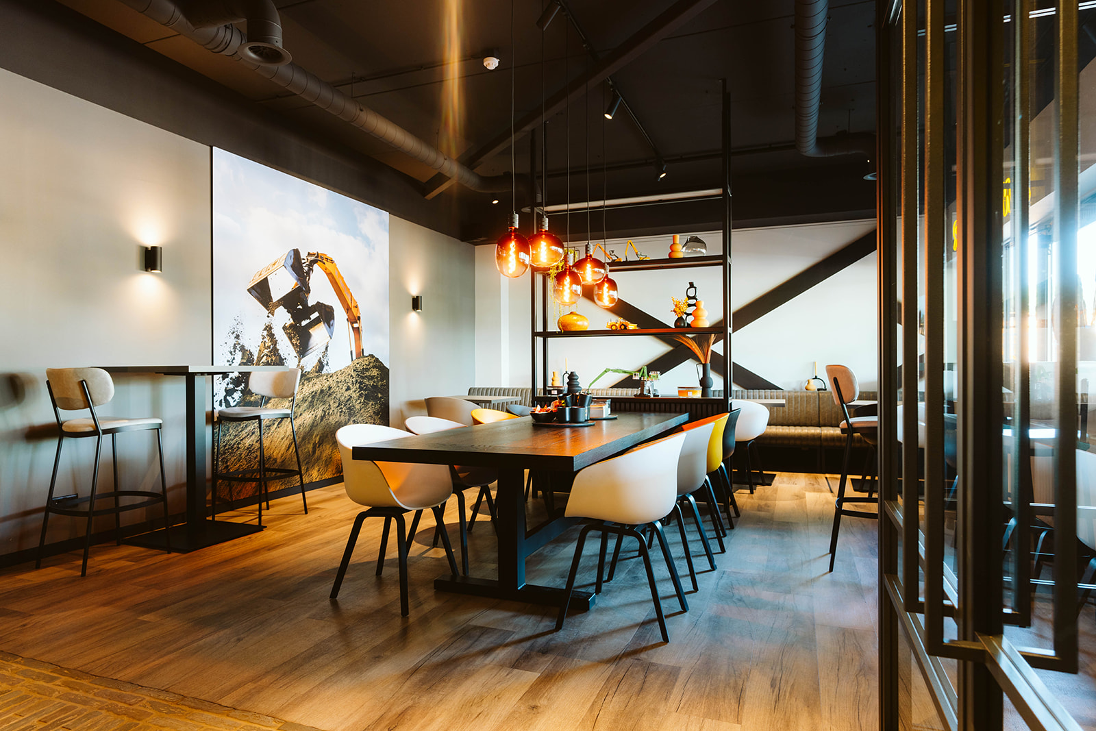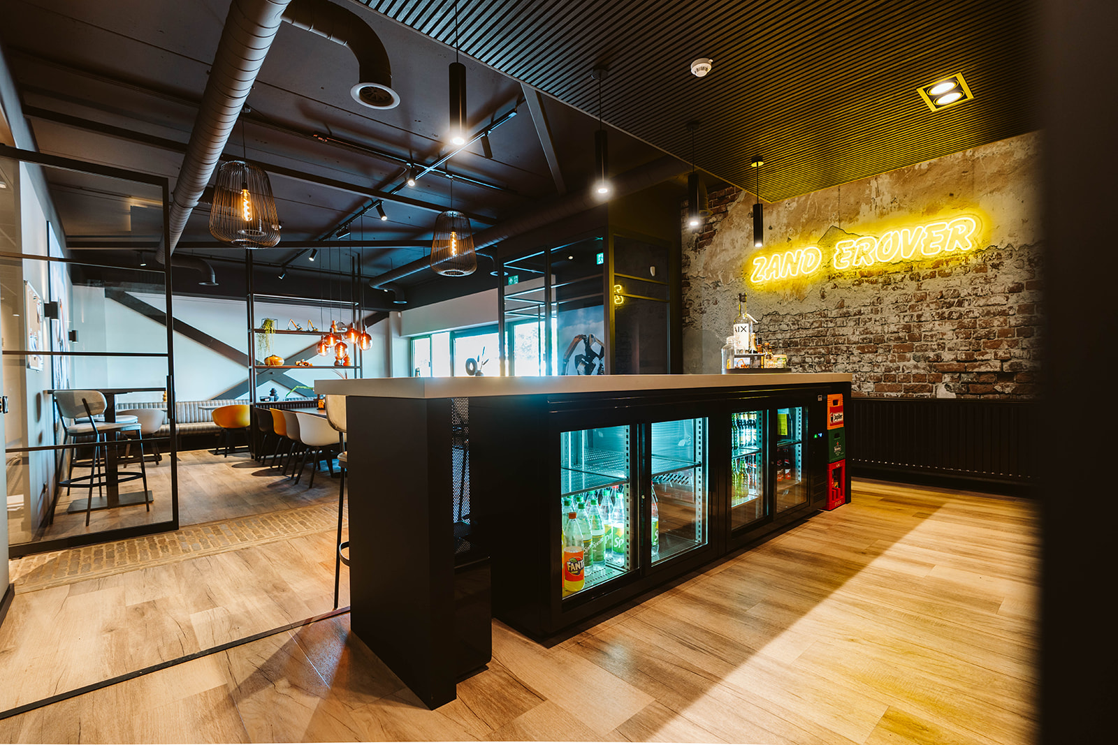 Op deze pagina ziet u de bedrijfskantine. Een op maat gemaakte keuken met bar en veel koelkastruimte. Voldoende opberg mogelijkheden voor lege kratten en een gebruiksvriendelijk interieur. Geheel volgens de wensen van de opdrachtgever. Het plafond is voorzien van akoestische panelen, die ook in de stalen roomdivider zijn verwerkt. Dit maakt dat de akoestiek in de ruimte prettig en sfeervol aanvoelt. De keuken, tafels en kasten zijn op maat gemaakt.
