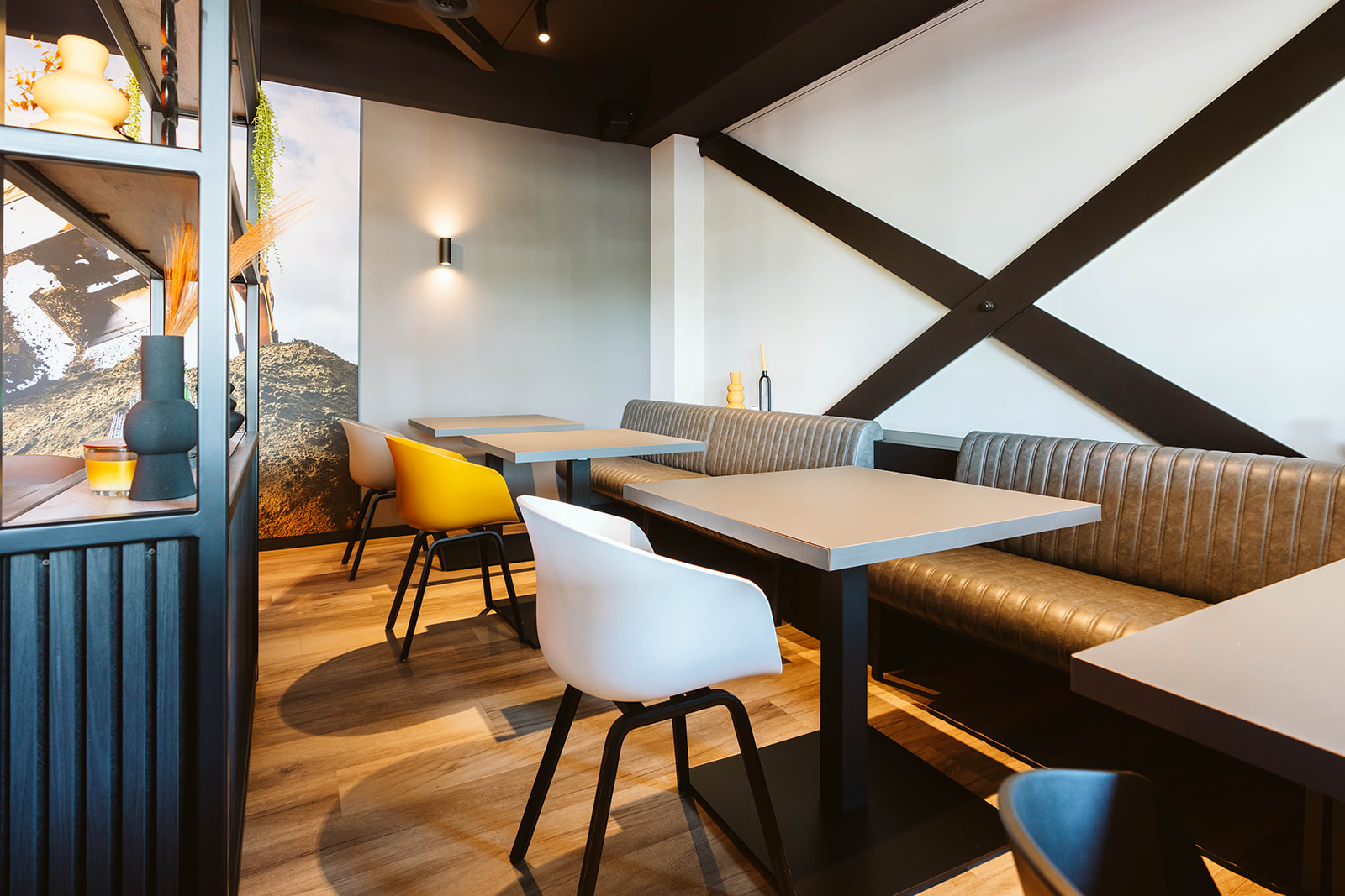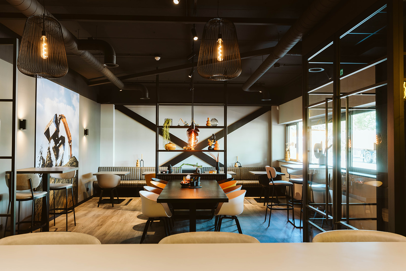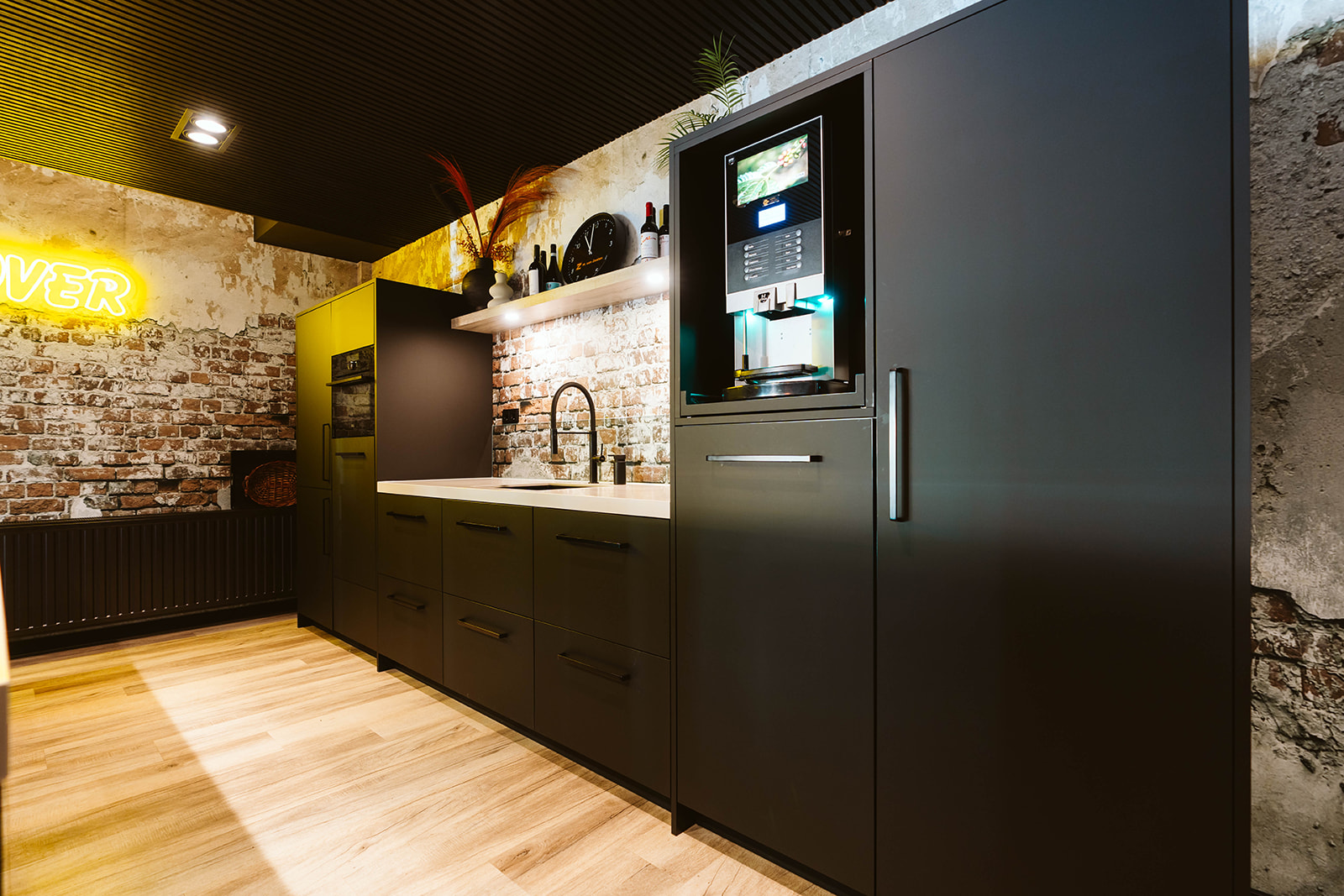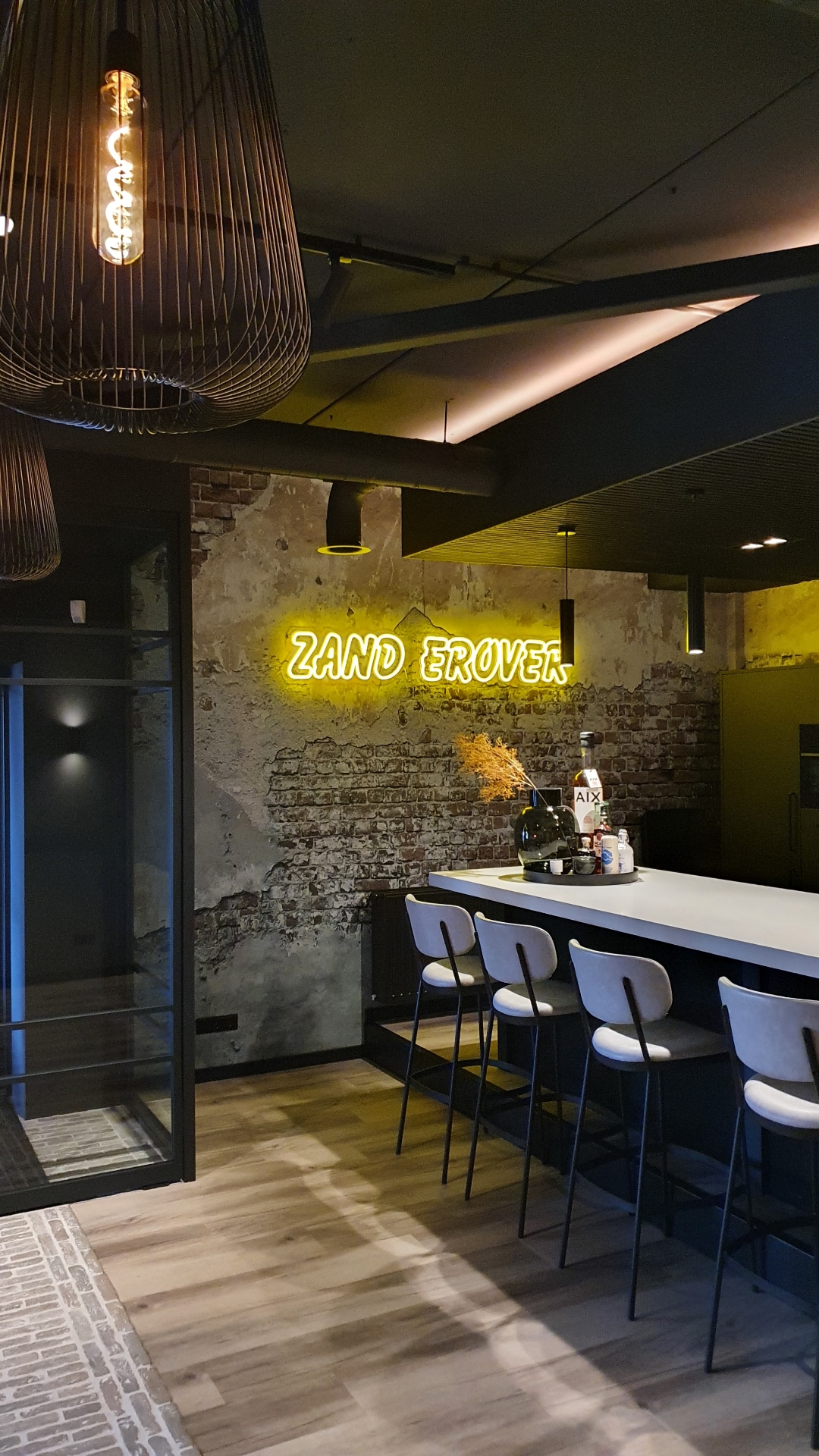 Op deze pagina ziet u de bedrijfskantine. Een op maat gemaakte keuken met bar en veel koelkastruimte. Voldoende opberg mogelijkheden voor lege kratten en een gebruiksvriendelijk interieur. Geheel volgens de wensen van de opdrachtgever. Het plafond is voorzien van akoestische panelen, die ook in de stalen roomdivider zijn verwerkt. Dit maakt dat de akoestiek in de ruimte prettig en sfeervol aanvoelt. De keuken, tafels en kasten zijn op maat gemaakt.