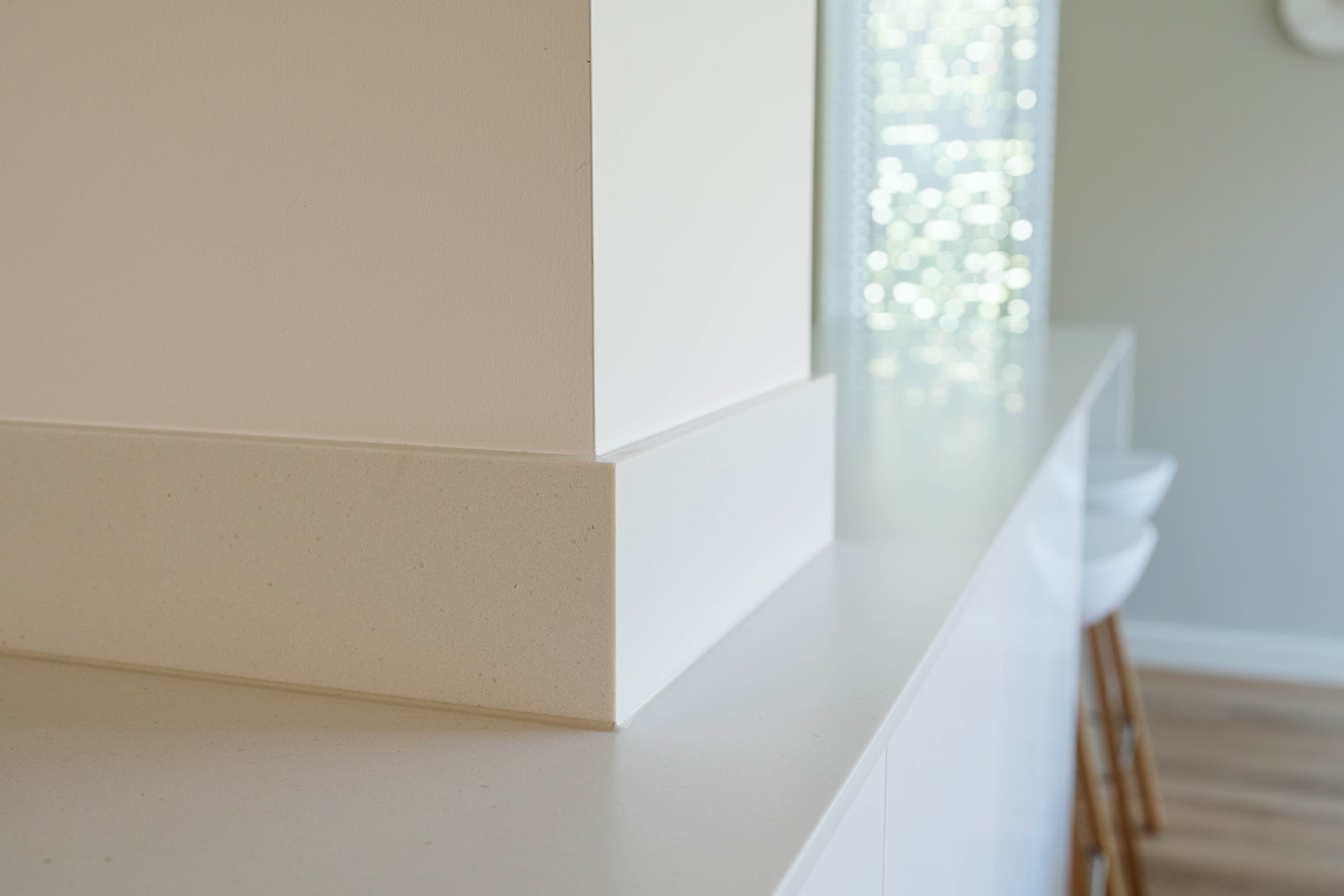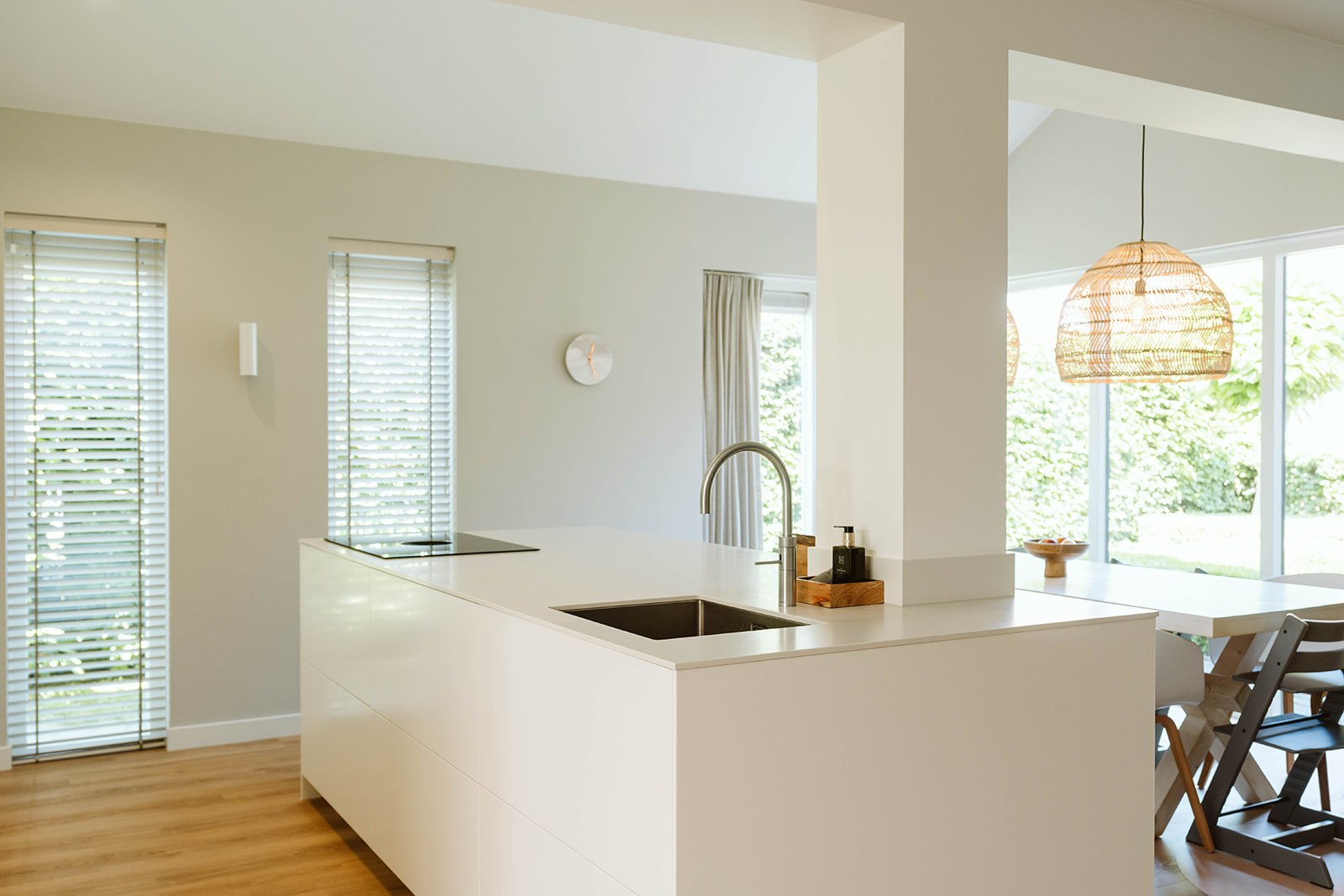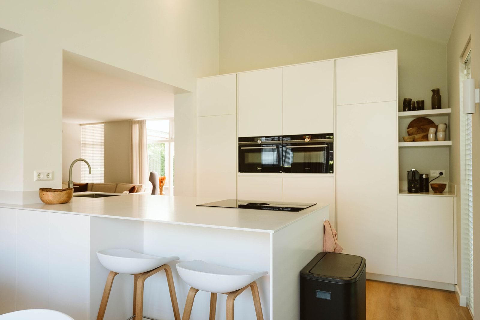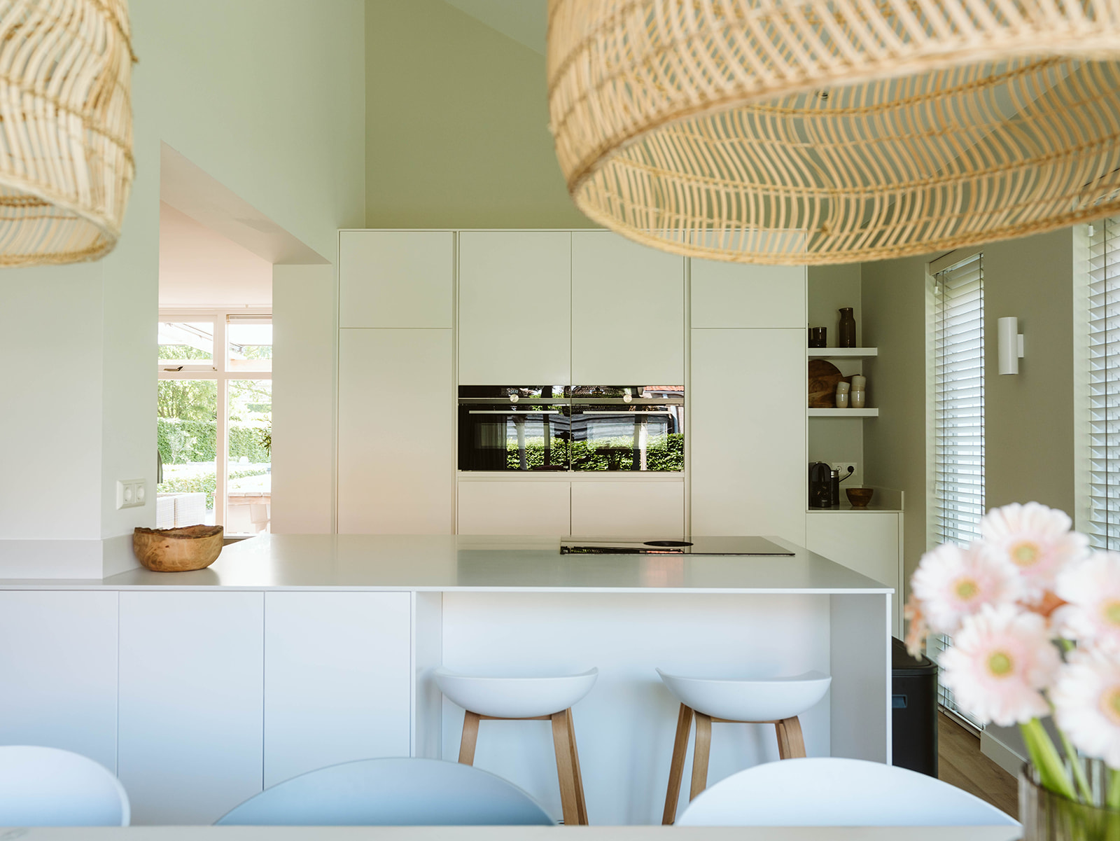 Een rustige, strakke witte keuken met een ultradun Solid Surface werkblad. Dankzij het verhoogde plafond komen de hoge kasten goed tot hun recht, symmetrisch geplaatst met een koffiecorner ernaast. De steunpilaar is naadloos weggewerkt in het kookeiland met Solid Surface werkblad. Aan de geïntegreerde bar kun je comfortabel zitten terwijl er wordt gekookt. De kastdeuren zijn volledig greeploos en voorzien van een push-to-open mechanisme, ook vervaardigd van Solid Surface.