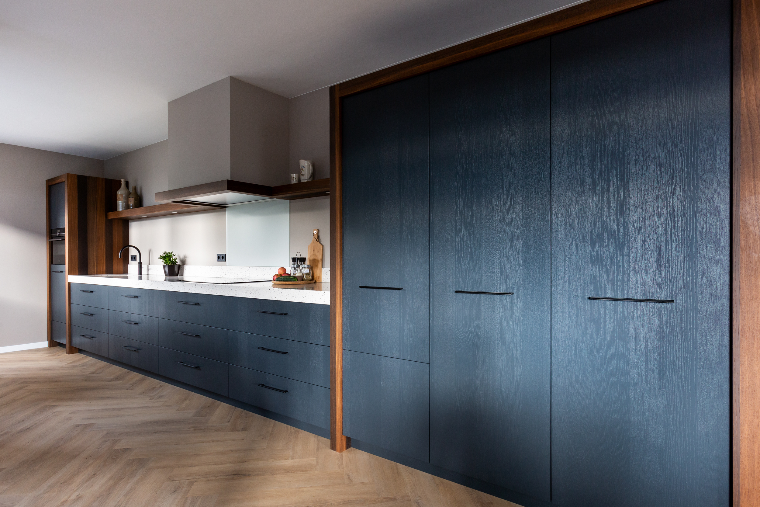 Bij deze keuken hebben we overal dezelfde structuur toegepast. Voor zowel de houten zijwanden als de uni kasten.