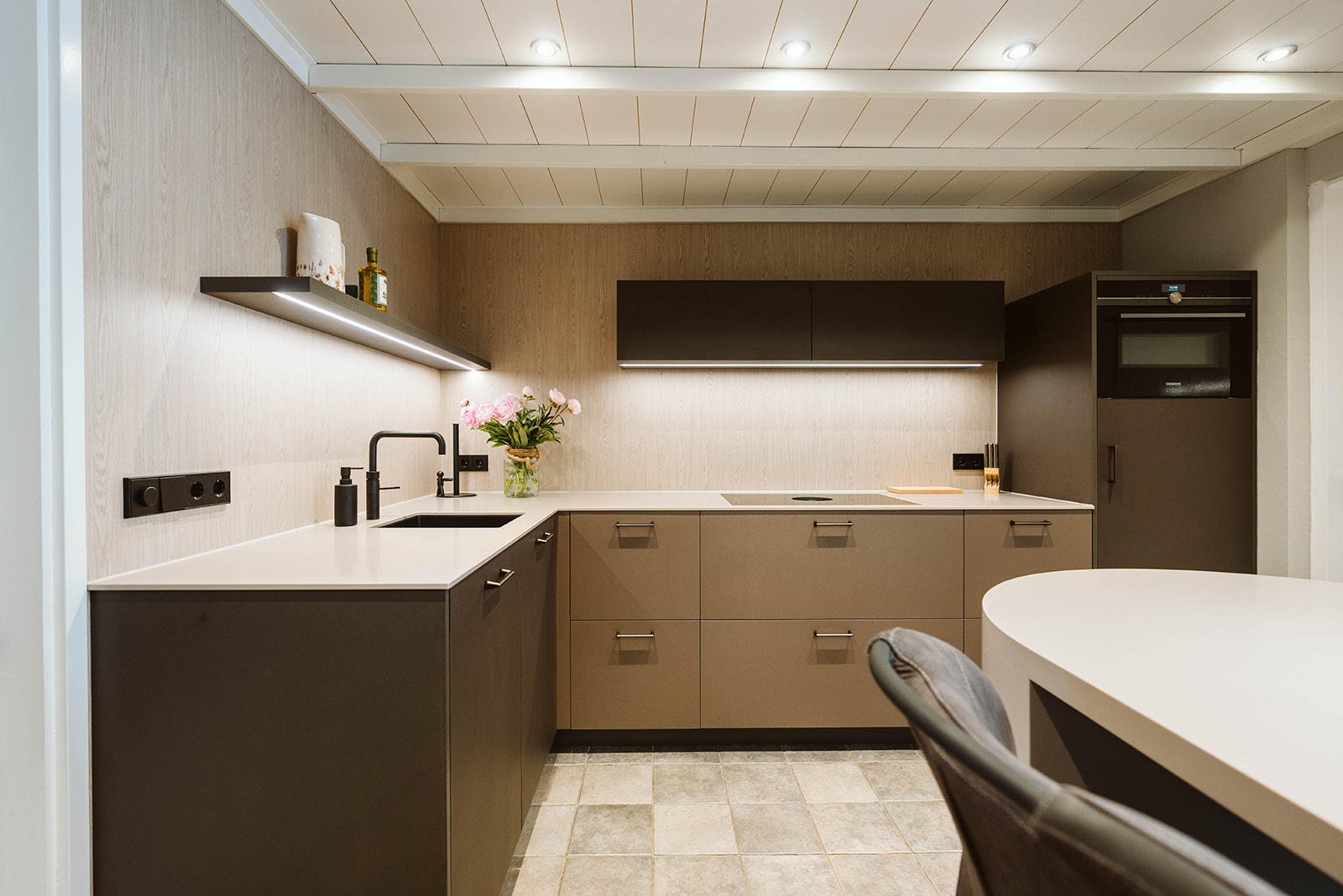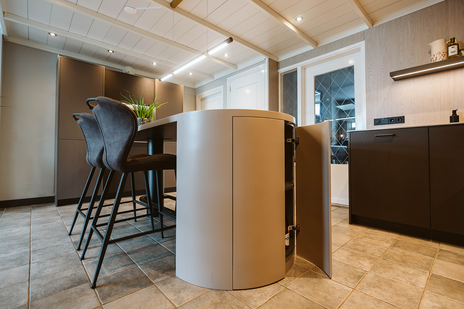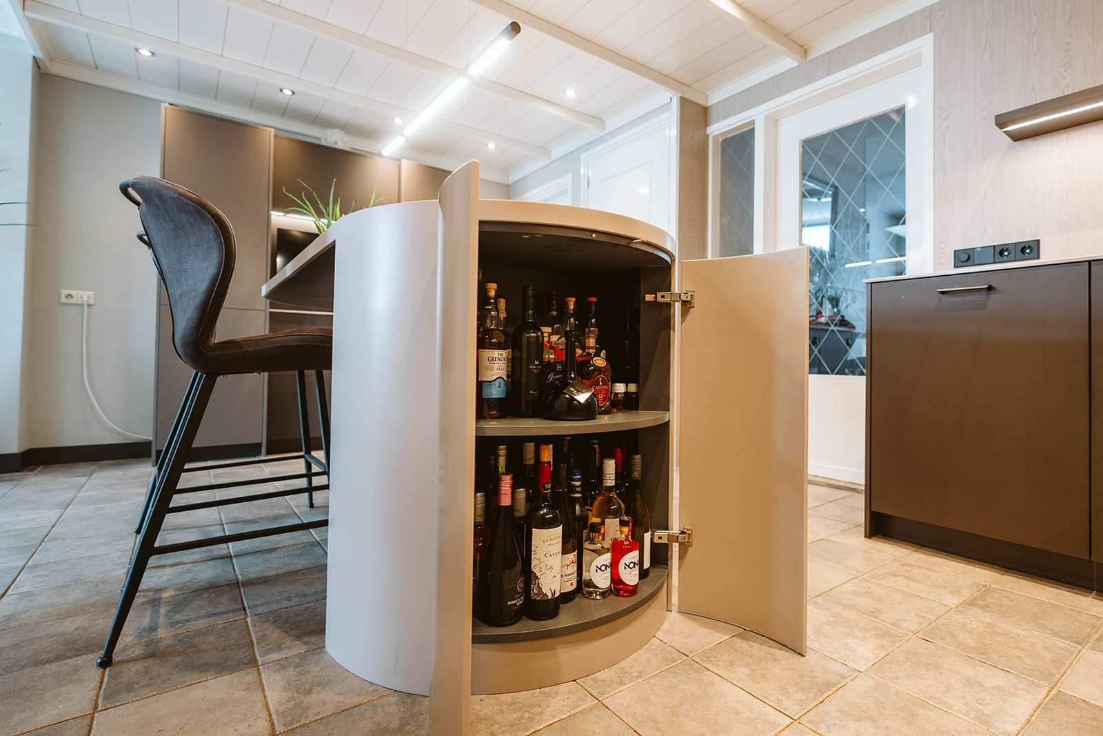 In deze keuken is alles net even anders. We hebben gebruikgemaakt van interessante materialen voor de keukenkasten. De hoge kastdeuren hebben een bruin-grijs leermotief, terwijl de ladefronten een beigebruine metallic kleur hebben. De achterwand is uitgevoerd in een houtlook, wat een warme uitstraling geeft. Het werkblad is gemaakt van ultradun Solid Surface, waarvan we ook de ovale bartafel hebben gemaakt. Onder de bartafel hebben we een halfronde drankkast geplaatst, compleet met metalen poot en voetensteun, waardoor de bartafel een echte eyecatcher is geworden.