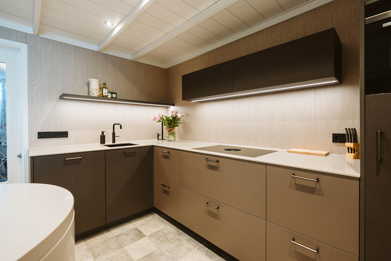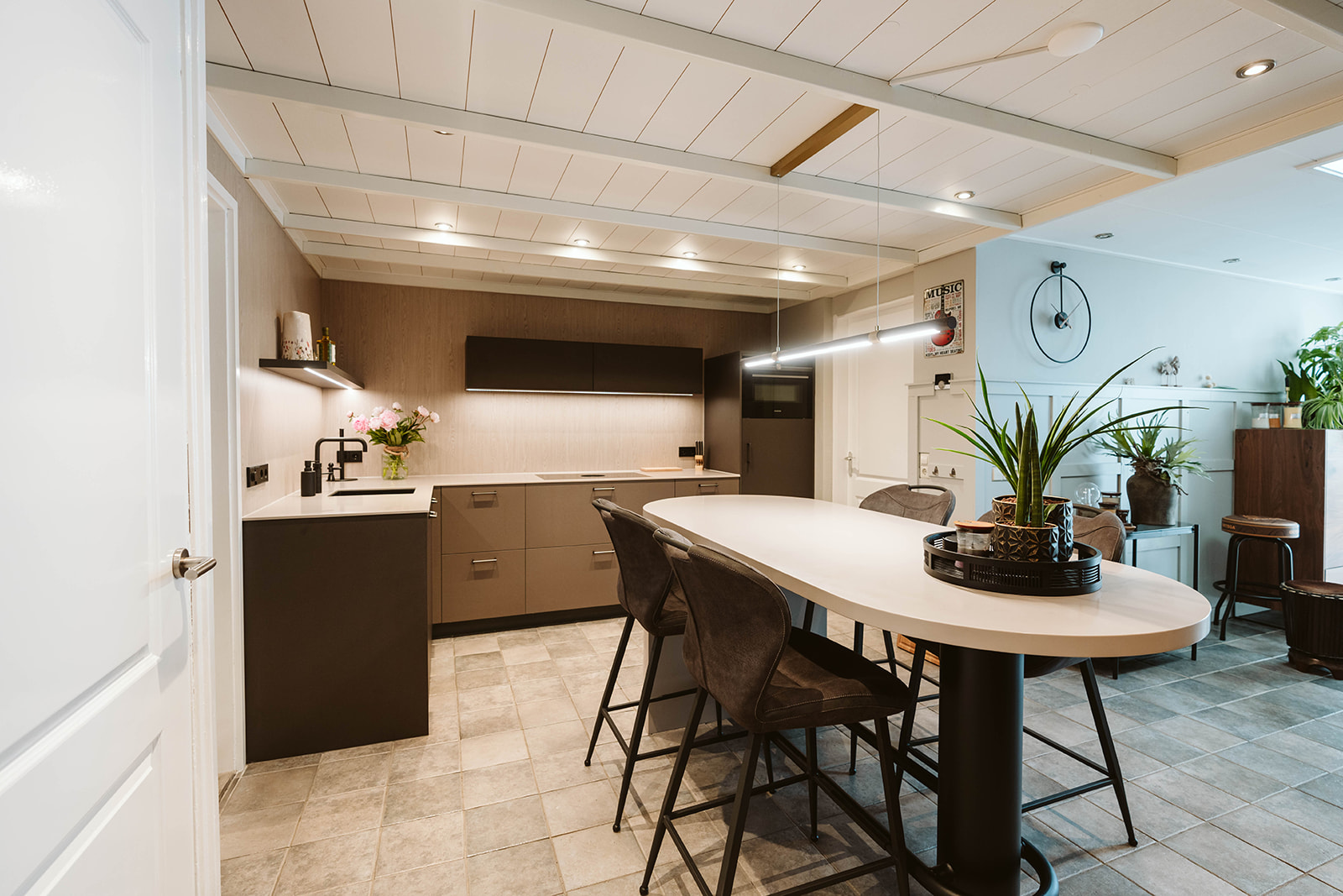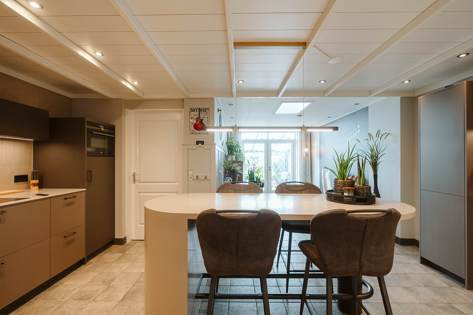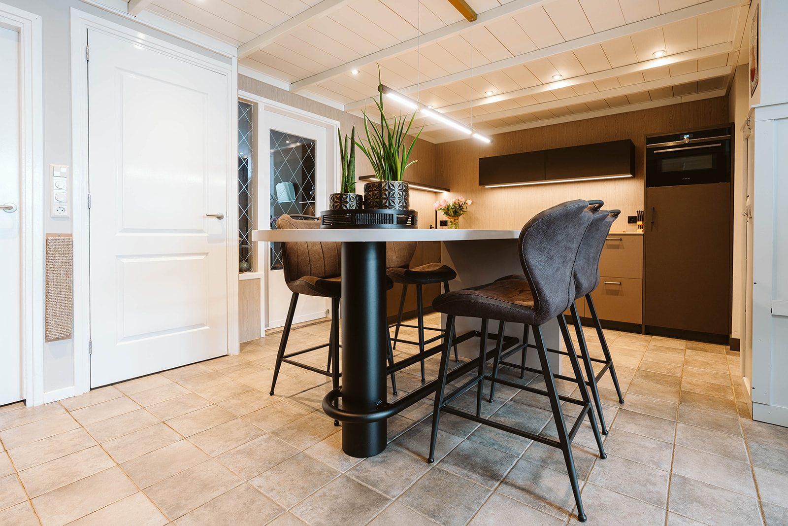 In deze keuken is alles net even anders. We hebben gebruikgemaakt van interessante materialen voor de keukenkasten. De hoge kastdeuren hebben een bruin-grijs leermotief, terwijl de ladefronten een beigebruine metallic kleur hebben. De achterwand is uitgevoerd in een houtlook, wat een warme uitstraling geeft. Het werkblad is gemaakt van ultradun Solid Surface, waarvan we ook de ovale bartafel hebben gemaakt. Onder de bartafel hebben we een halfronde drankkast geplaatst, compleet met metalen poot en voetensteun, waardoor de bartafel een echte eyecatcher is geworden.