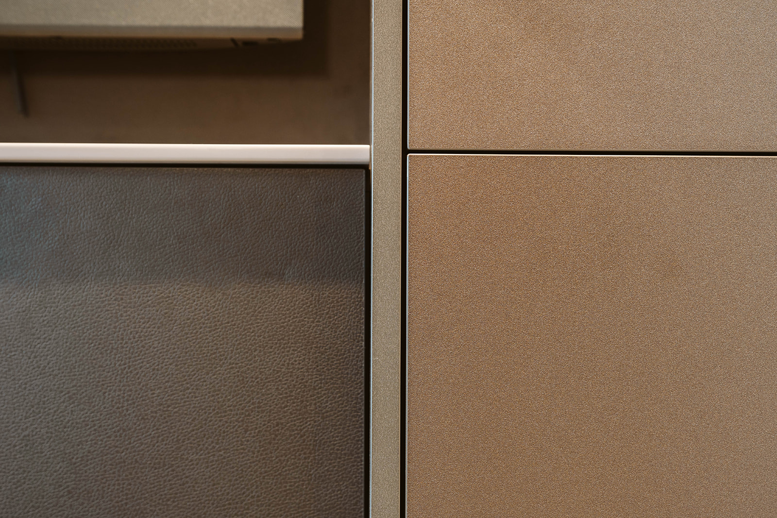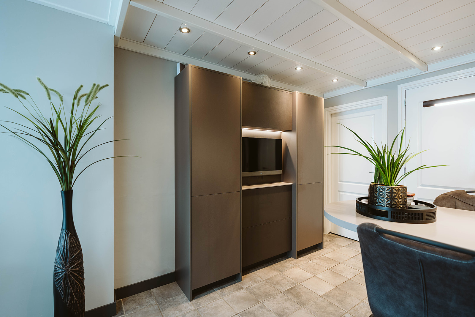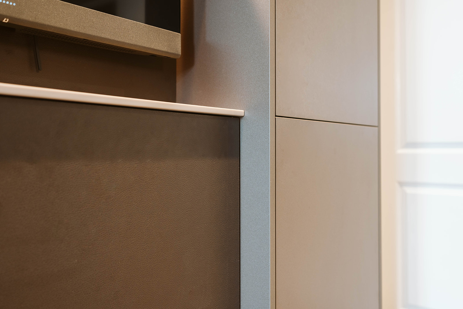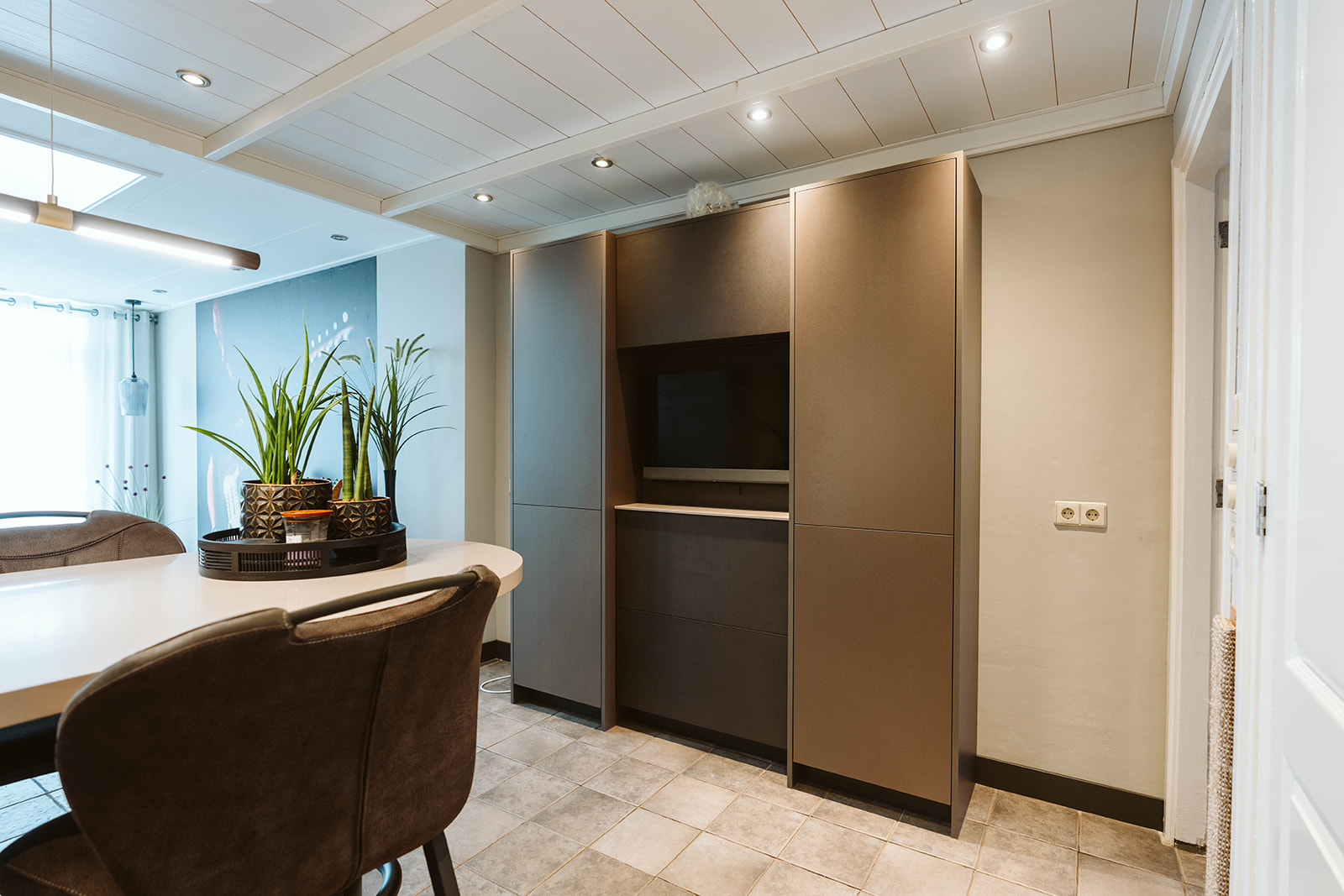 In de servieskast met tv hebben we het materiaalgebruik omgekeerd. Hier zijn de hoge kasten gemaakt van beigebruine metallic en de middenkast heeft een leermotief. Het resultaat is een prachtig geheel dat volledig aan de wensen van de klant voldoet.