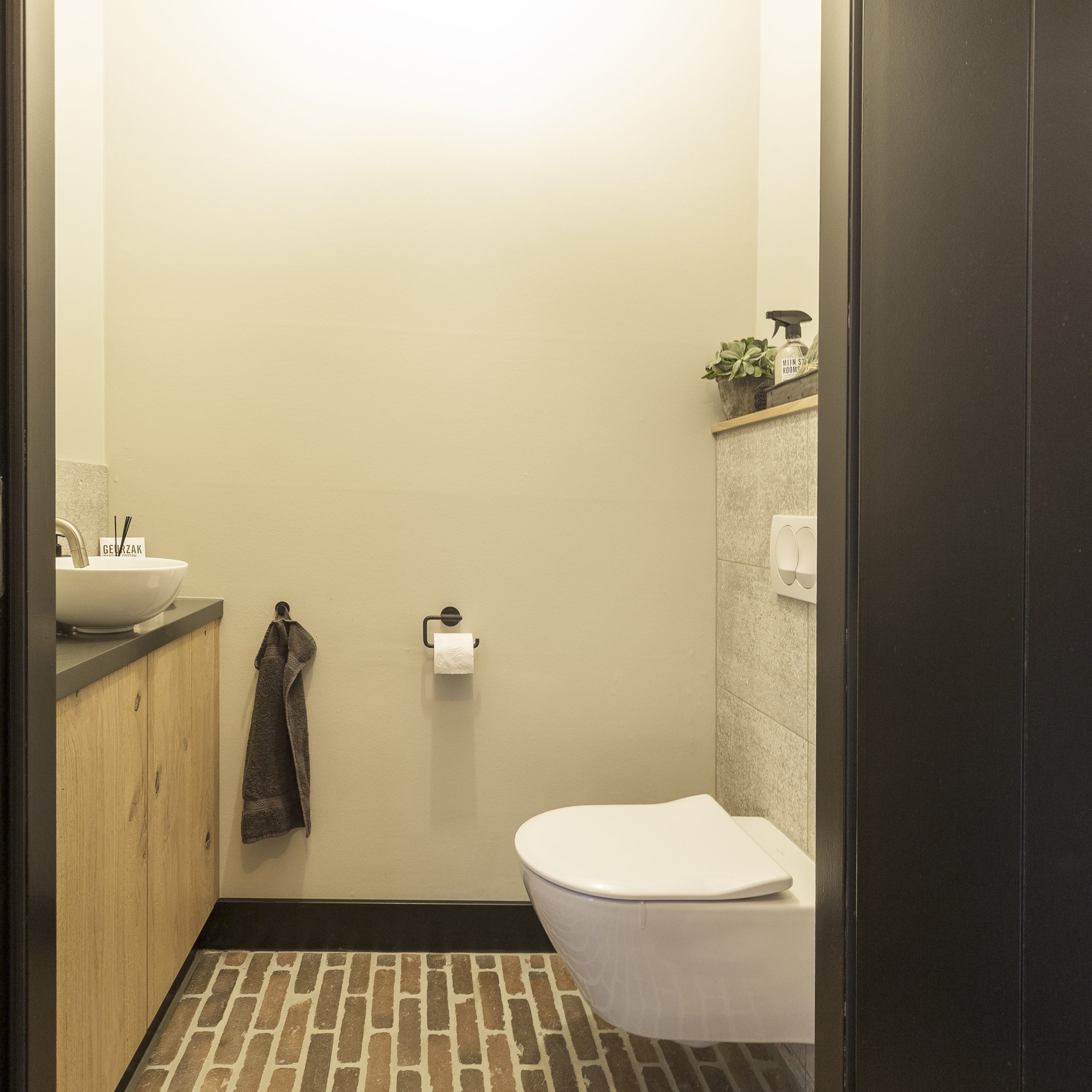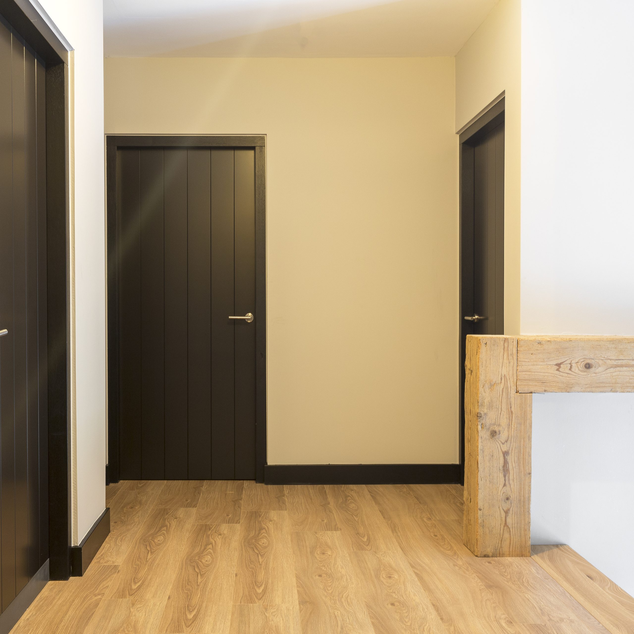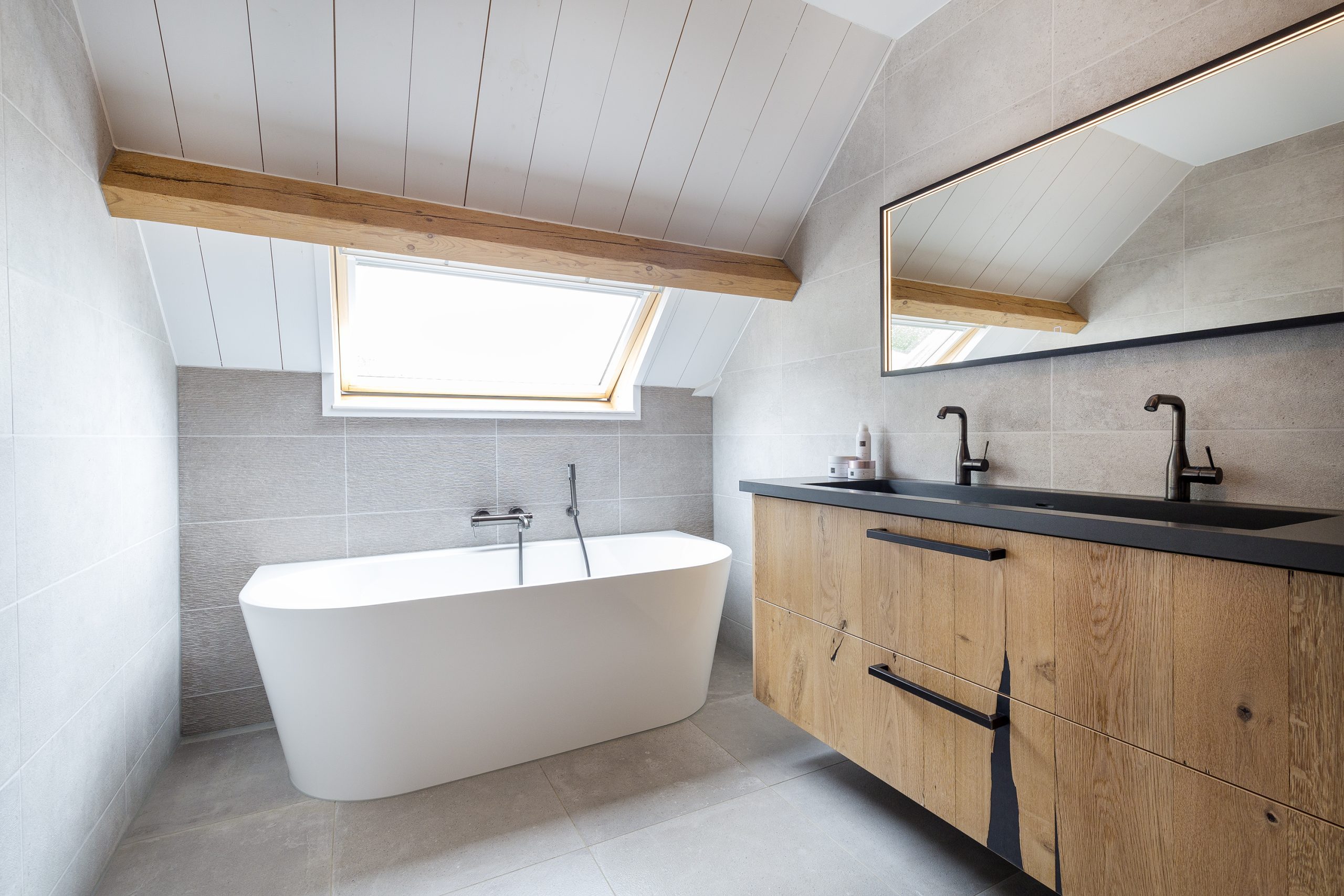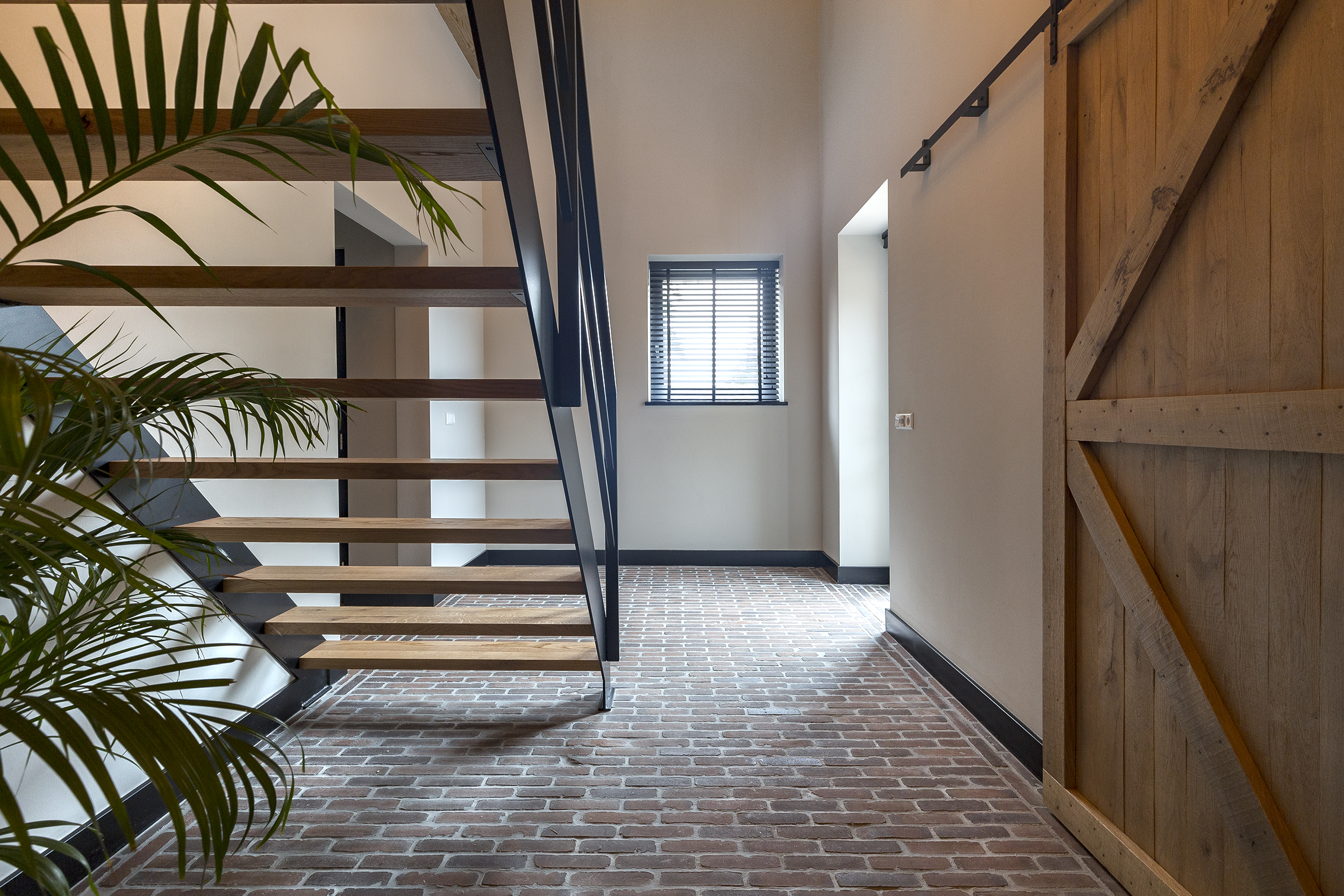 o.a. Een stalen trap met eiken treden, een badkamermeubel, barn-schuifdeuren, een toiletmeubel en alle binnendeuren